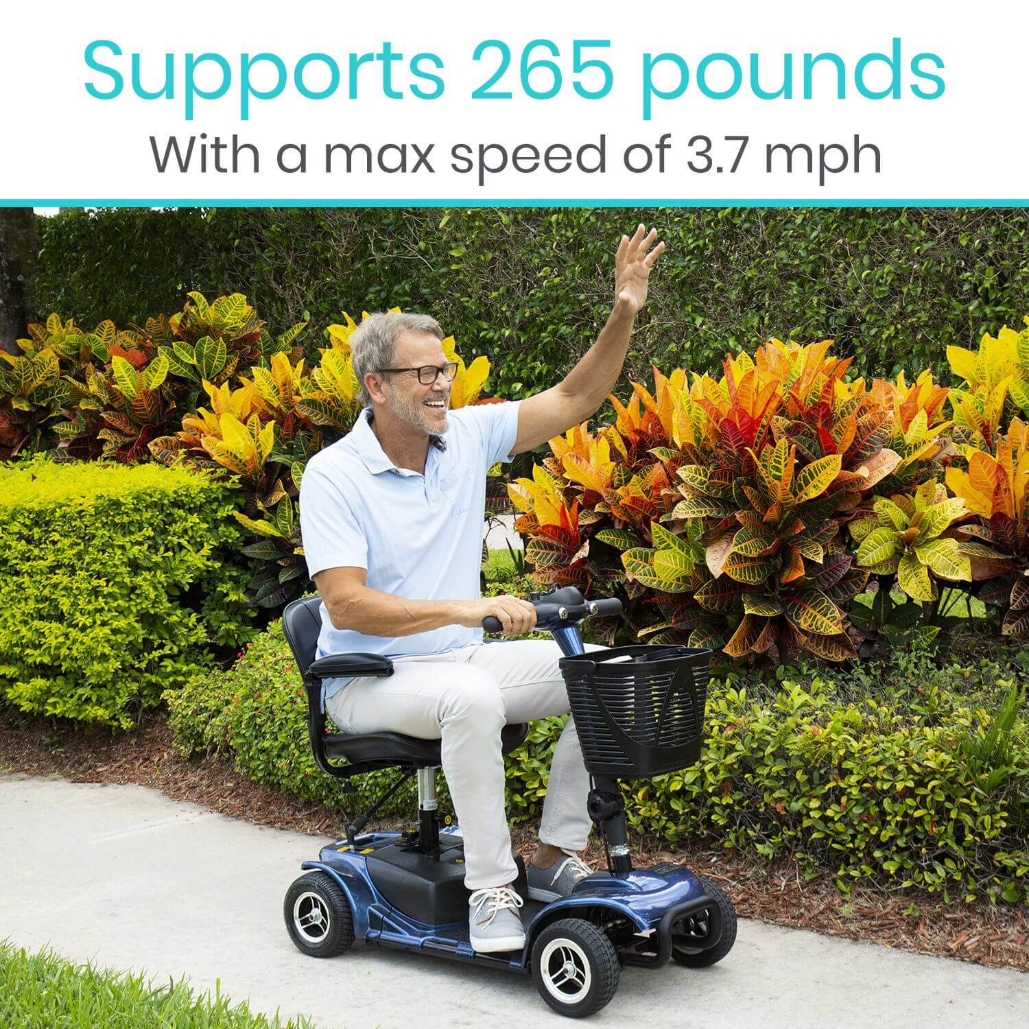 Safely Navigate Smooth Surfaces - Easy maneuver over smooth, indoor and outdoor surfaces with comfort and ease with the Vive four-wheel mobility scooter. Designed to safely support up to 265 pounds, the mobility scooter features 8” flat-free, non-marking tires, a maximum speed of 3.7mph and a driving distance up to 12.4 miles per charge.