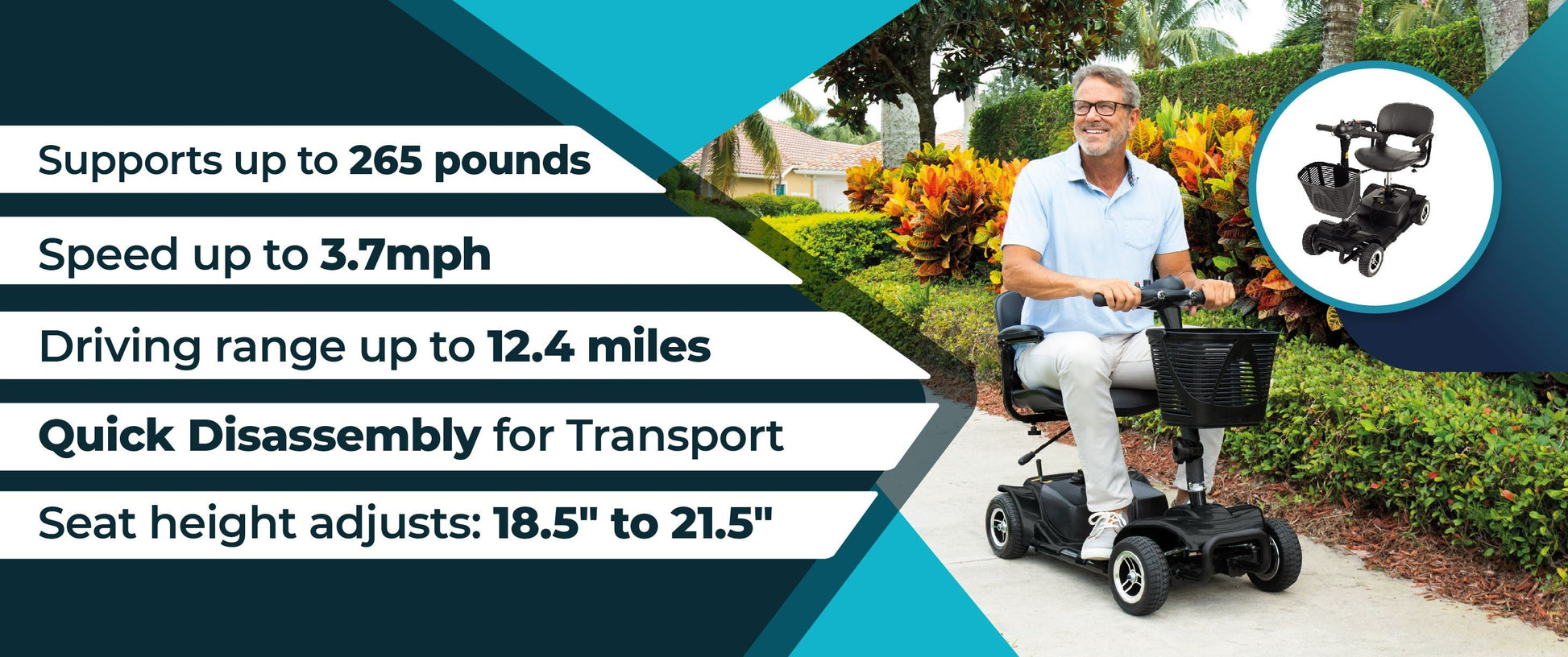 Providing safe, stable mobility assistance, the Vive four-wheel mobility scooter easy maneuvers over smooth, indoor and outdoor surfaces such as concrete, pavement, tile and carpeting with a turning radius of 51.5". The mobility scooter includes a lightly padded seat and backrest with flip-back armrests, 8” flat-free tires and a front-mounted storage basket for carrying daily necessities. With a top speed of 3.7 mph, the mobility scooter has a driving range of up to 12.4 miles per charge. The power scooter also quickly disassembles into four pieces to easily fit in an average size vehicle.