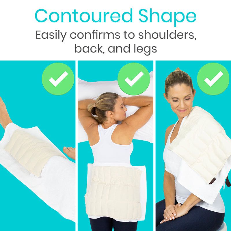 Designed to lay along the neck and shoulders, the contour pack measures 24” in length for optimal coverage. The soothing heat pack features a curved design that easily conforms to the neck and drapes over the shoulders.